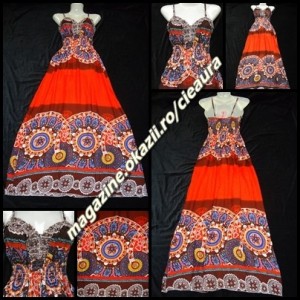 Rochie Lunga Bretele Decoltata Imprimeu Viu Colorat Artizanal Fond Rosu Corai Coral Colectie Noua Rochii Vara Zi Plaja Seara Marime Universala Albastru Fuchsia